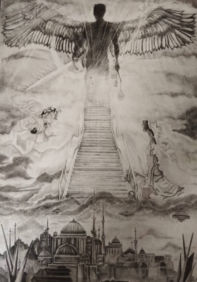 Die Inspiration zu diesem Bild fand ihren Anfang in GTA5, durch einen jungen Mann, der in den Niederlanden lebt und aus dem muslimischen Glauben kommt. Nachdem das Motiv feststand, begann auch die lange Reise. Die ersten Striche der Entstehung fanden ihren Anfang in Wien, die nächsten wurden in Serbien gesetzt und gingen dann weiter nach Montenegro, um in Wien schlussendlich vollendet zu werden. Jedoch beginnt erst ab hier das Wunder. Als ich dem jungen Mann das vollendete Werk zeigte, kam eine unerwartete Antwort: „Mächtig. Dieses Werk gehört nur dir, ich kann ihm keinen Preis aufsetzen.“ Also veröffentlichte ich es, bei Sozialmedia und ein Ehepaar zeigte mit diesen Worten ihr Interesse an meinem Werk: „Mächtig. Wir möchten es erwerben aber als Leinwand-Aufdruck, denn das Original gehört nur dir, wir können ihm keinen Preis aufsetzen.“ Also fragte ich sie, was sie sich vom Bild erwarten und wo sie es aufhängen wollten. Ihre Antwort: „Es soll in unserem Büro hängen und uns Erfolg bringen.“ Also sagte ich zu. Jetzt hängt es in ihrem Büro und die Aufträge häufen sich. Jeder der bei mir zu Hause zu Besuch war und vor diesem Bild stand, hatte nur ein Wort auf den Lippen „MÄCHTIG“: